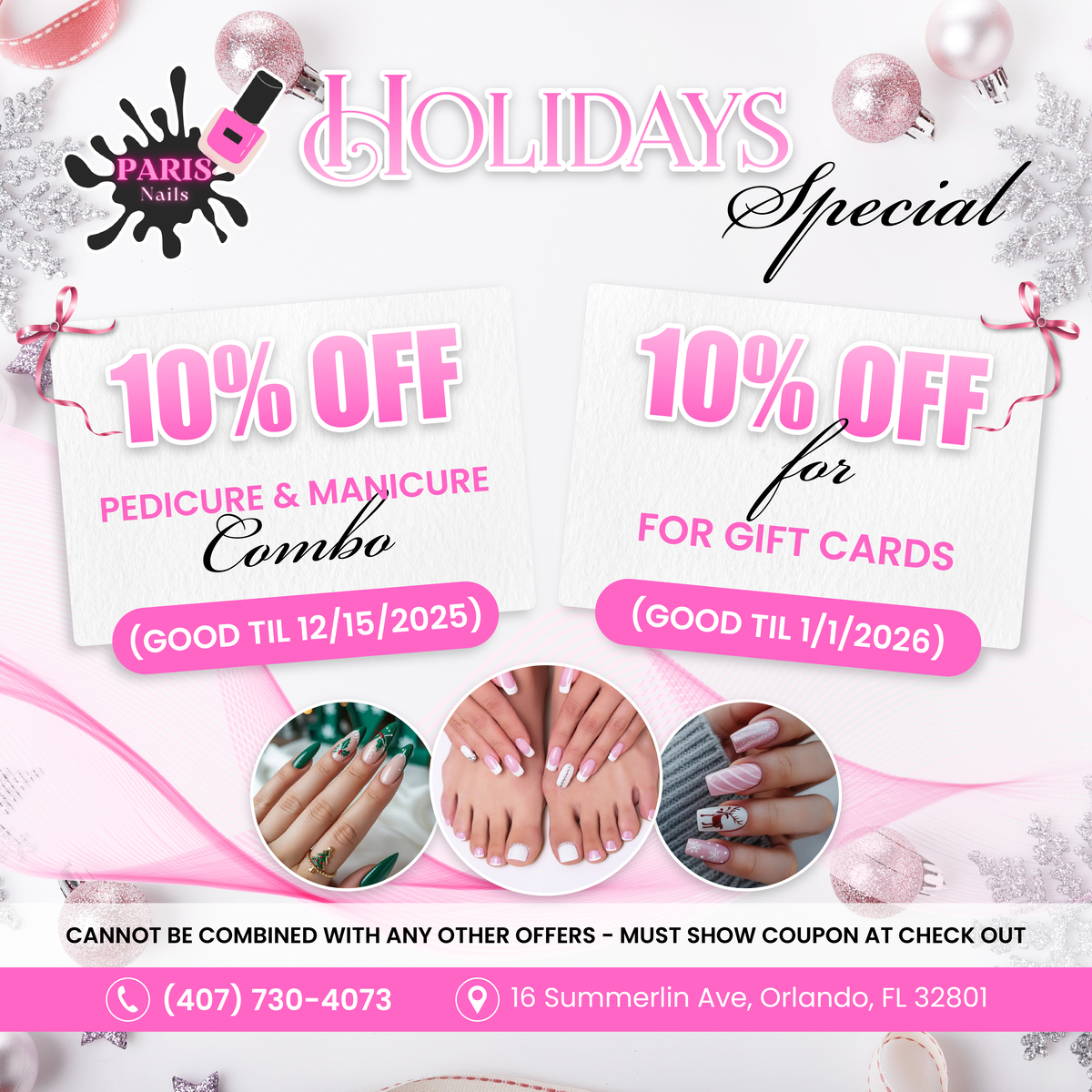 Welcome Paris Nails Spa in Orlando, FL 32801 offering the ultimate in pampering and restoring your beauty with professional trained, experienced nail technicians, highest quality products, and excellent customer services.